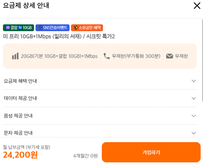 - 데이터: 월 20GB(기본 10GB + 결합 10GB) 제공, 소진 시 1Mbps 속도로 무제한 이용 가능